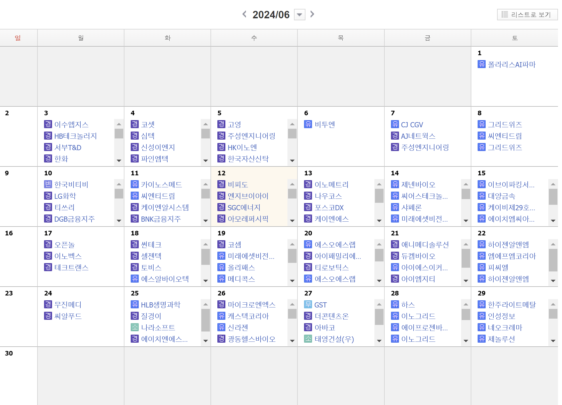 추가로, 캘린더 항목이 있는데, 여기서는 기업의 무상증자, 유상증자, 실적발표 등의 일정을 확인할 수 있습니다.
