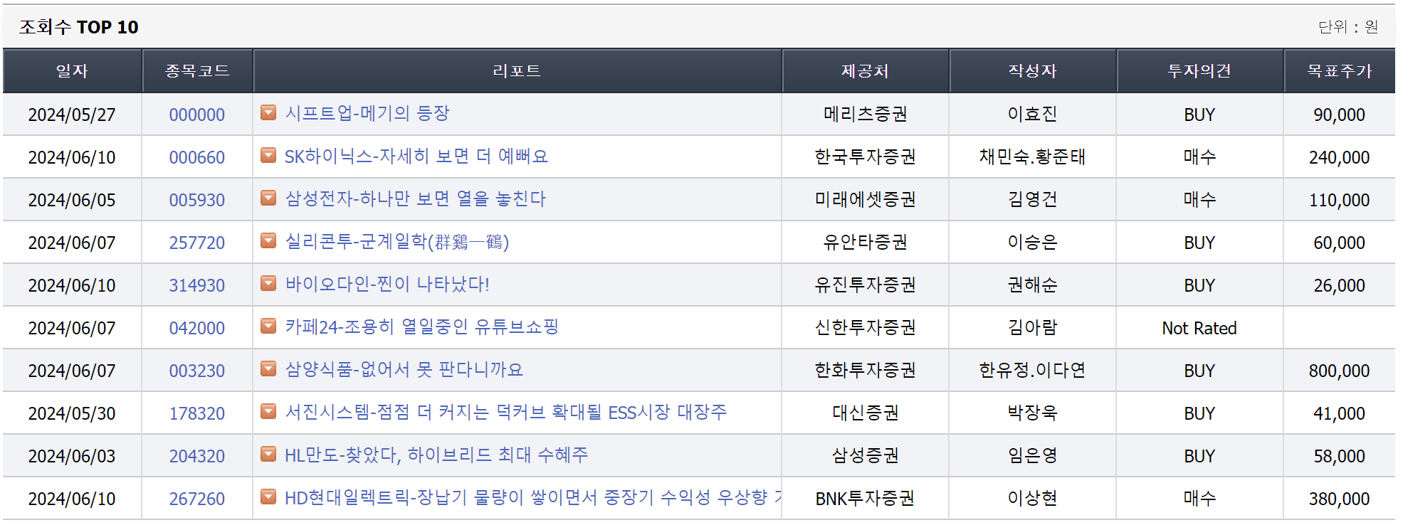 이뿐만 아니라 리포트-리포트 동향 탭에서는 조회수 TOP10을 확인할 수 있어 투자자들이 어떤 종목에 관심이 많은지도 확인할 수 있습니다. 주기적으로 들어가서 보면 개인들이 관심을 엿볼 수 있는데 도움이 될 것 같습니다.