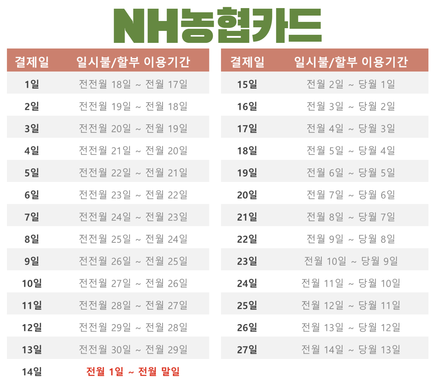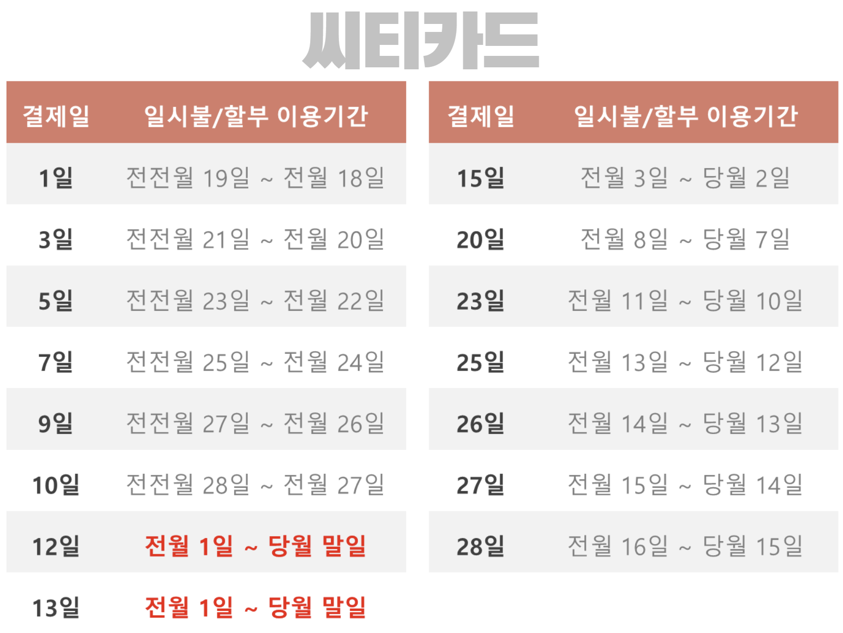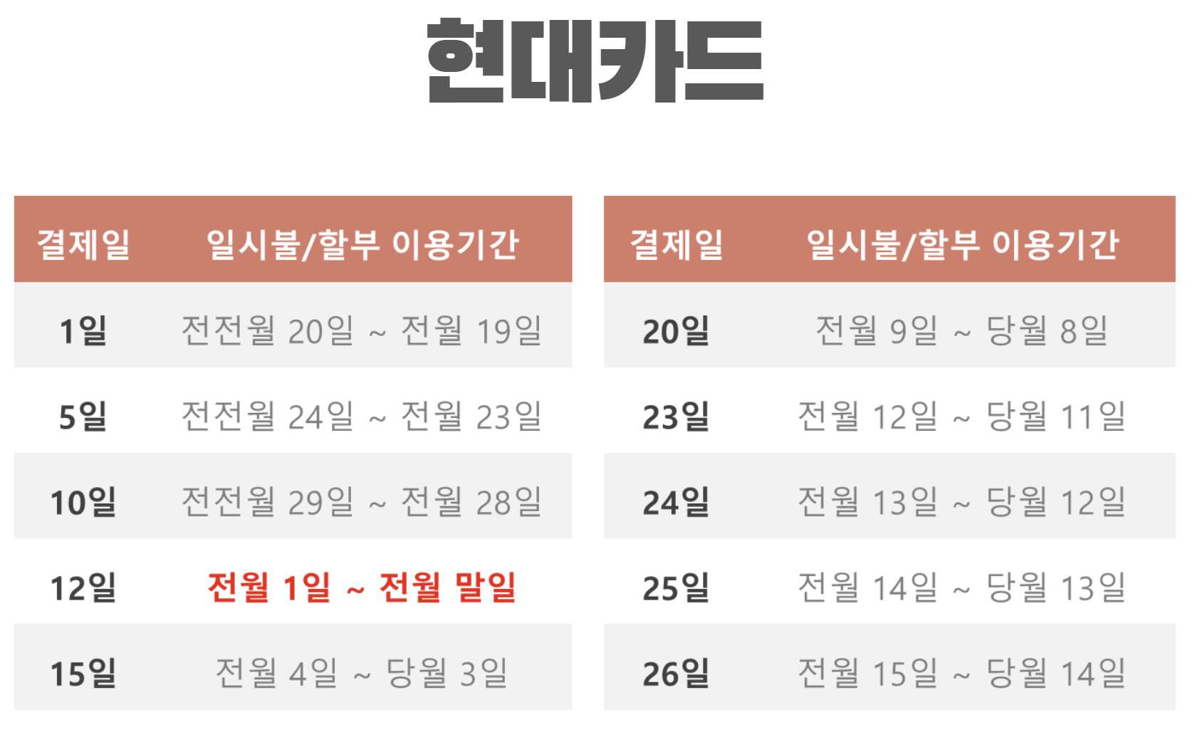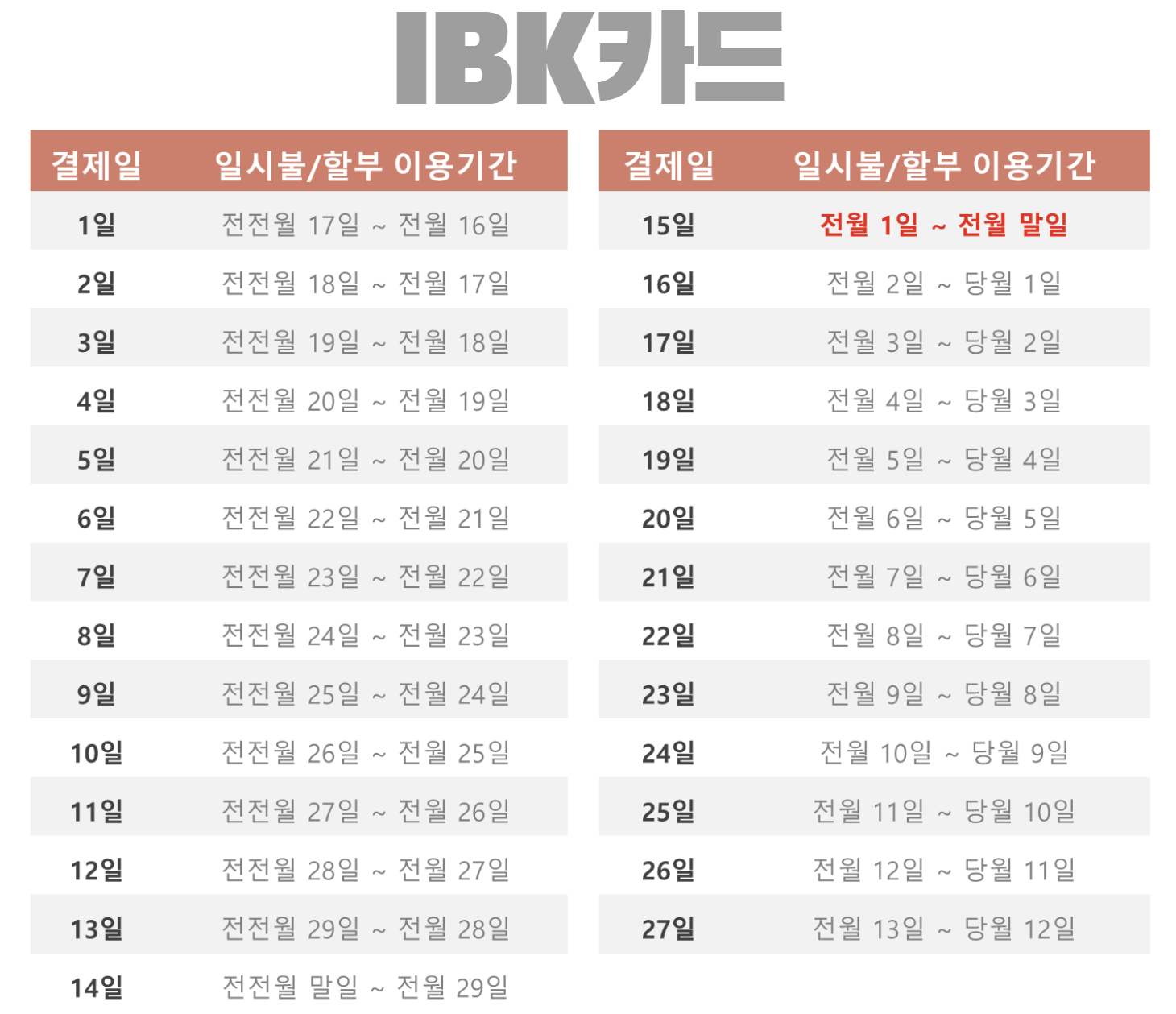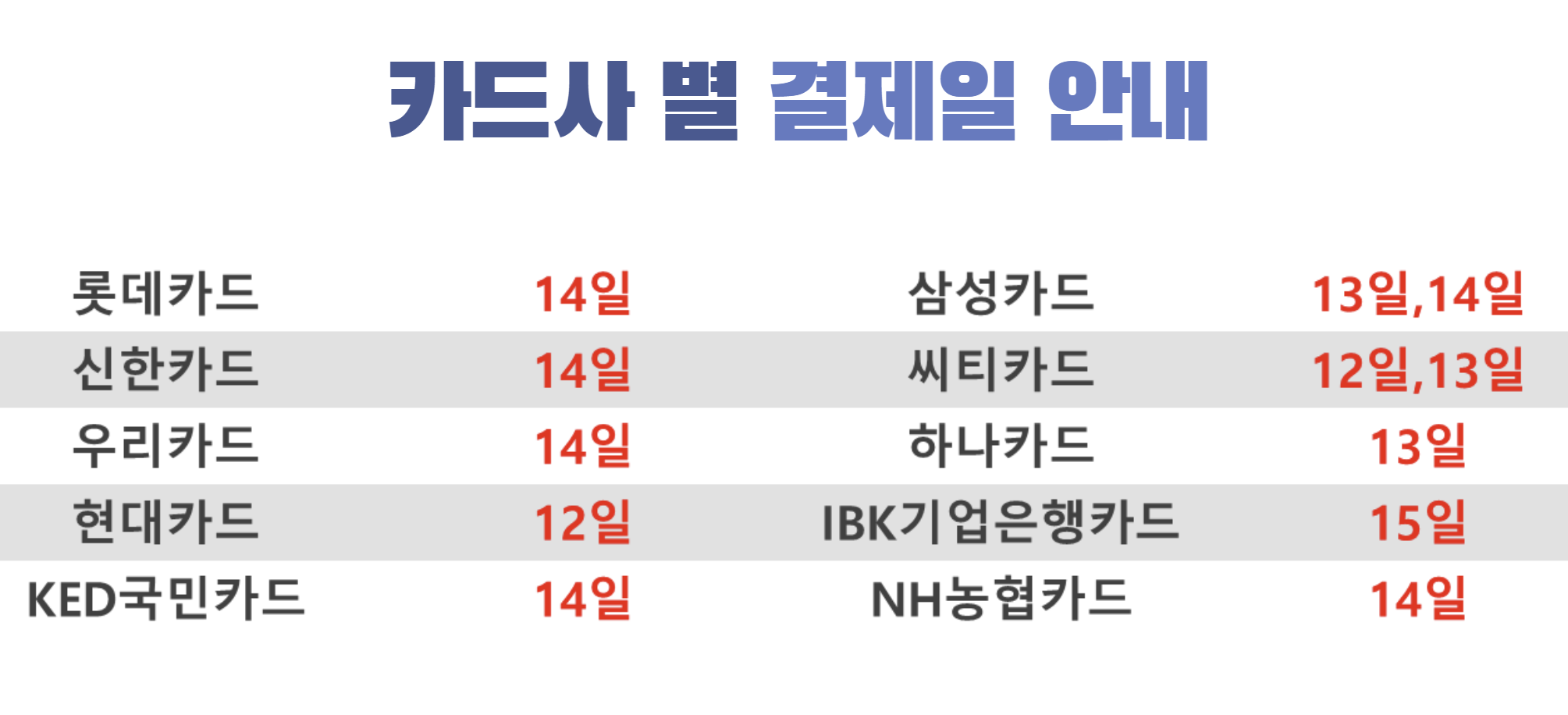 다음은 각 카드사의 결제일 별 이용기간입니다. 참고하여 원하는 날짜에 결제 될 수 있도록 하시면 됩니다.