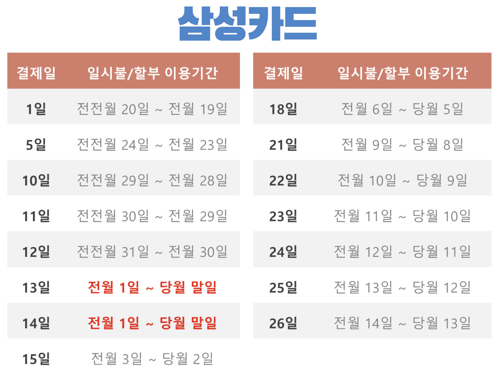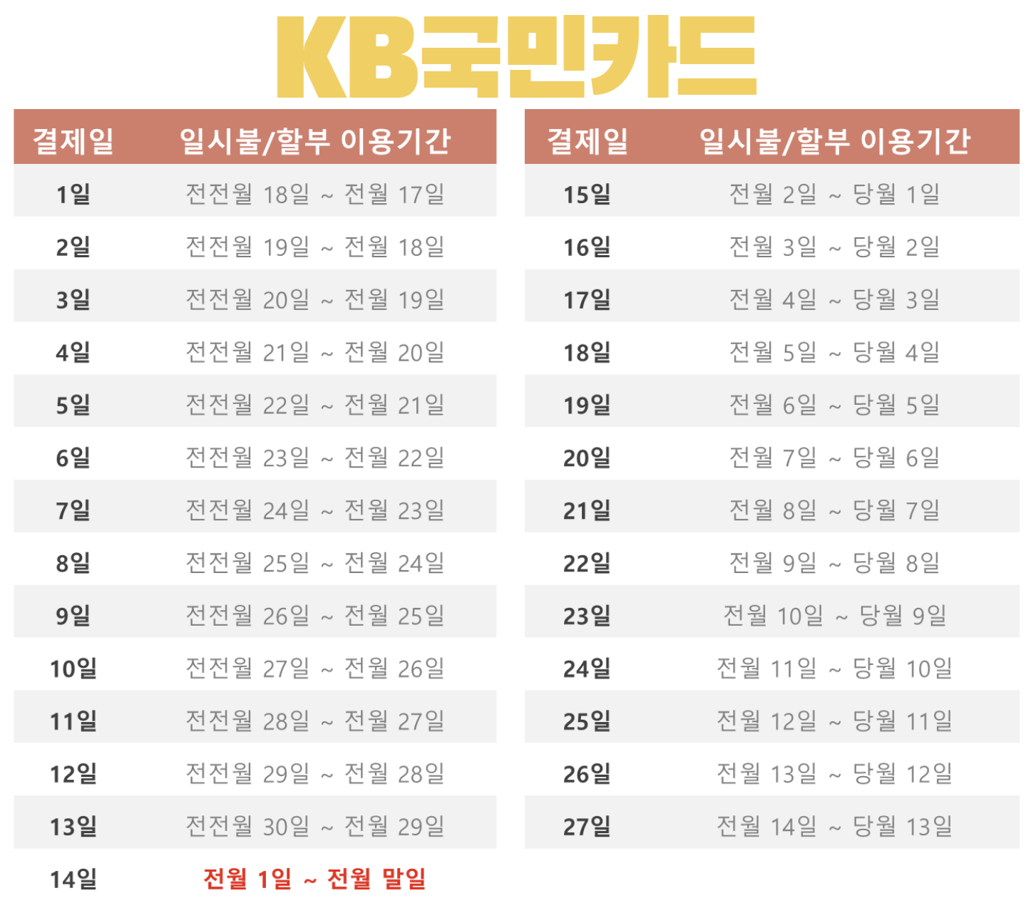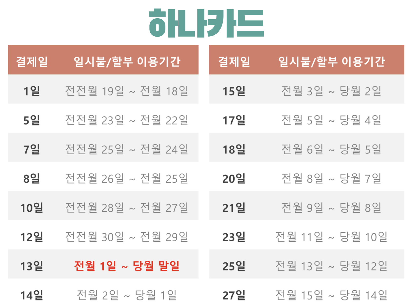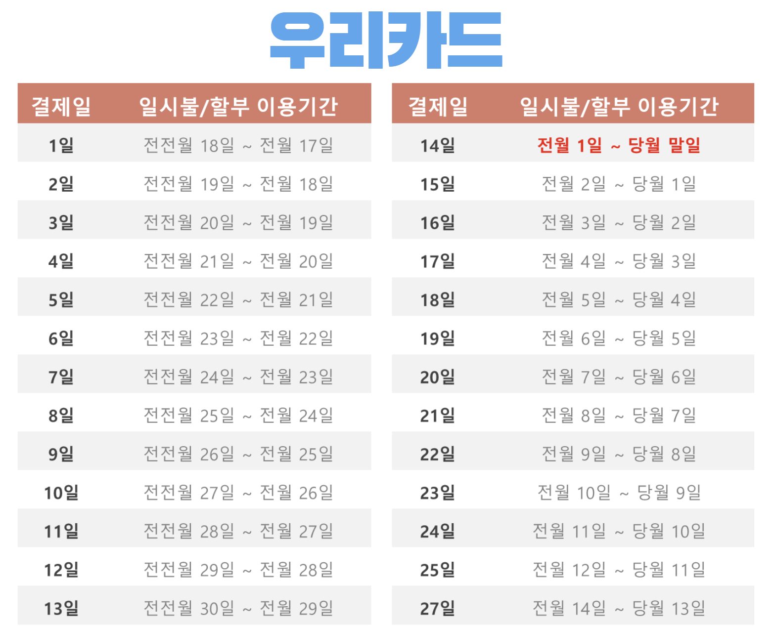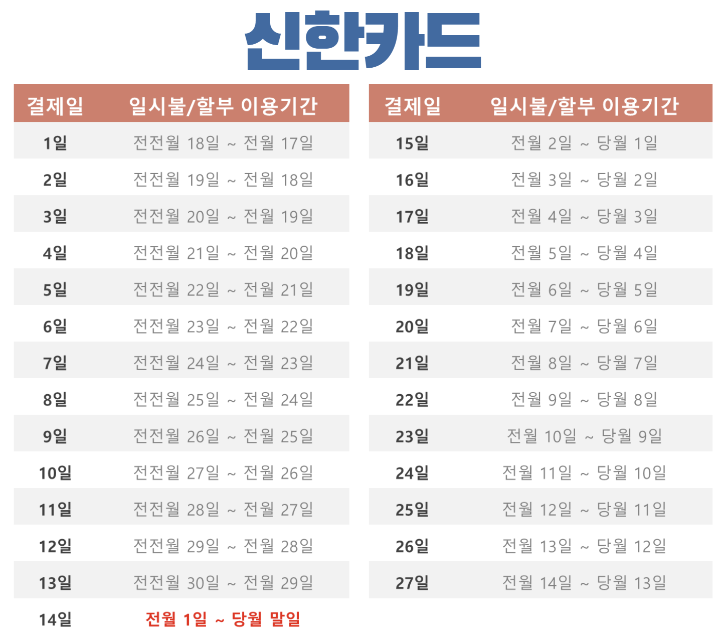 매달 1일부터 말일까지의 기준으로 가계 지출을 계획하고 있다면 신용카드 결제일 별 이용기간도 반드시 알아 두셔야 합니다. 지금부터 꼼꼼히 살펴볼게요!