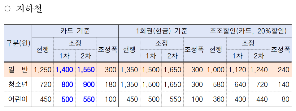 지하철 요금의 경우, 내년 하반기에 추가로 150원 인상되어 약 1년 사이 총 300원의 인상이 있을 예정입니다.