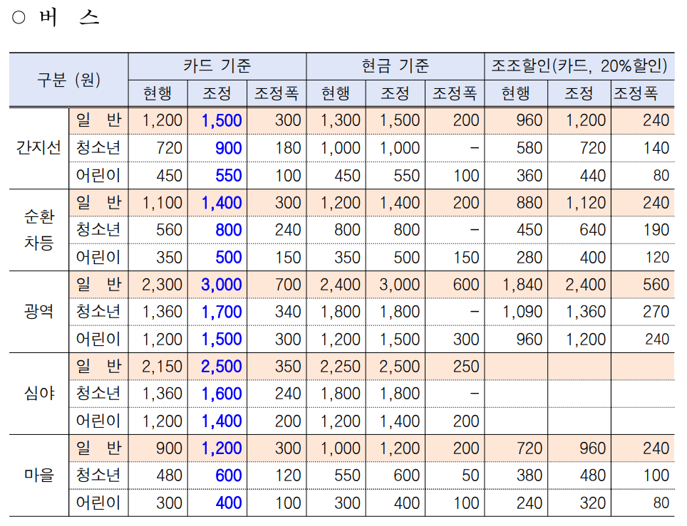 버스의 현금 요금은 카드 요금과 동일하게 맞추거나 동결하여 인상 폭을 최소화할 계획입니다.